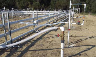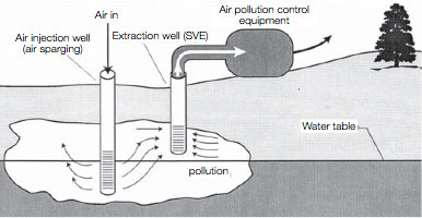 water pocket. Fresh air is forced into the groundwater in order to ‘bubble’ contaminants into a vapour pocket above the water. The contaminated air is pulled out of the pocket and can then be treated. The sparge runs continuously until the ground water is free of contaminants. Each sparge field uses anywhere from 100-150 meters.
